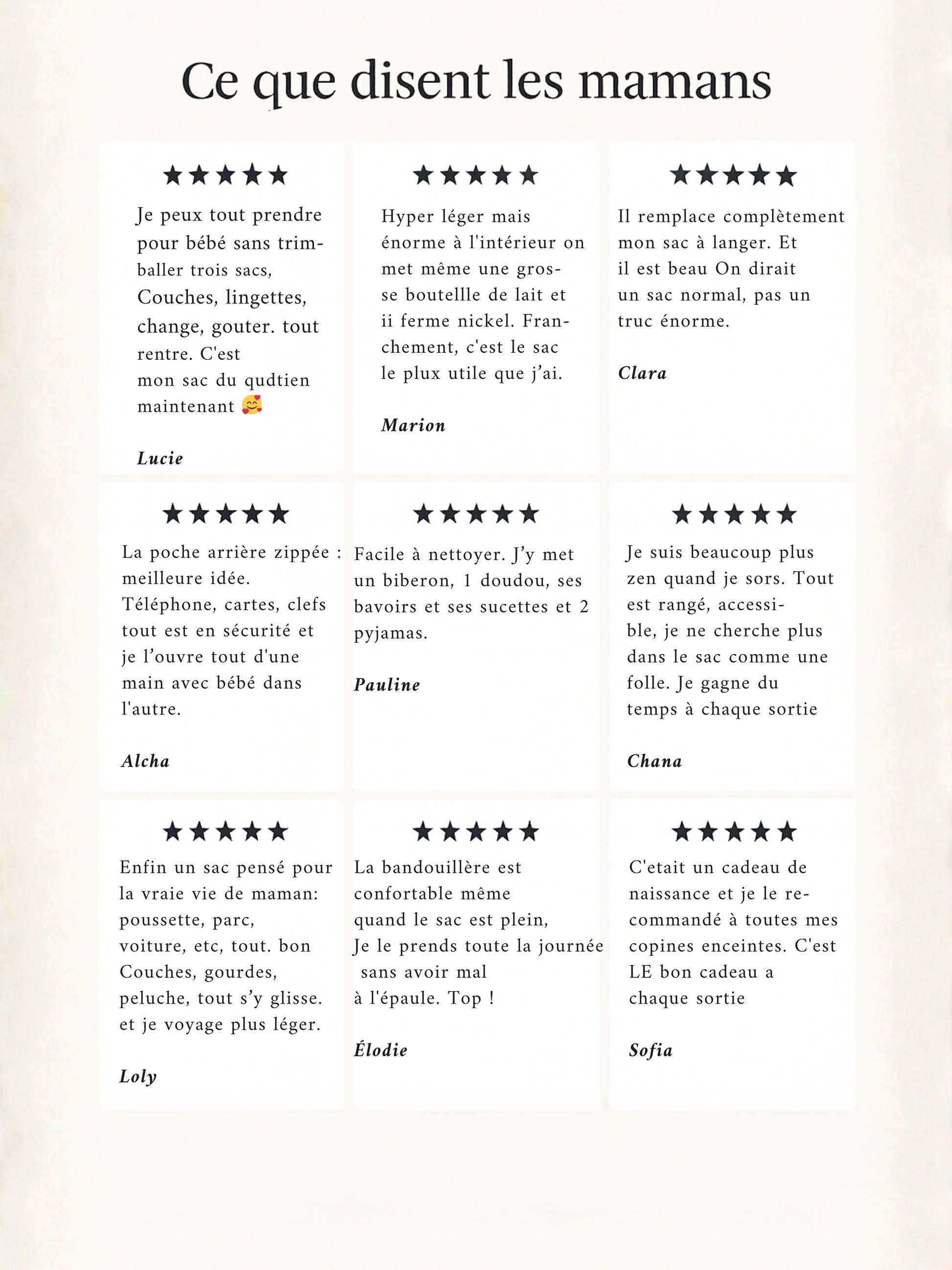Nous faisons en sorte que chaque maman soit pleinement satisfaite du premier clic jusqu’à la première sortie avec son sac.